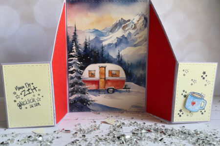 An einem romantischen, verschneiten Plätzchen in den Bergen campen.Ein schöner Gedanke, oder? Material: Aus meinem Bestand: Anleitung: Die Karte 2x aus lila Tonpapier ausstanzen, die beiden Mittelteile zusammenkleben.Aus Designpapier den großen Aufleger,rotem Tonpapier die beiden mittleren Aufleger und aus hellgelben tonpapier die kleinen Aufleger ausstanzen.Bestempeln …