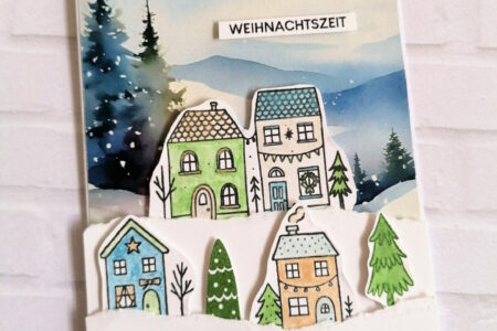 Designteambeitrag/enthält Werbung Ja liebe Bastelfreunde heute gibt es wieder eine Weihnachtskarte. Das neue Stempelset mit den Häuschen hatte es mir einfach angetan. Aus dem Designerpapier „Spaziergang im Winterwald“ suchte ich mir einen verschneiten Hintergrund mit Tannen aus. Diesen schnitt ich zurecht für eine weiße Karte …